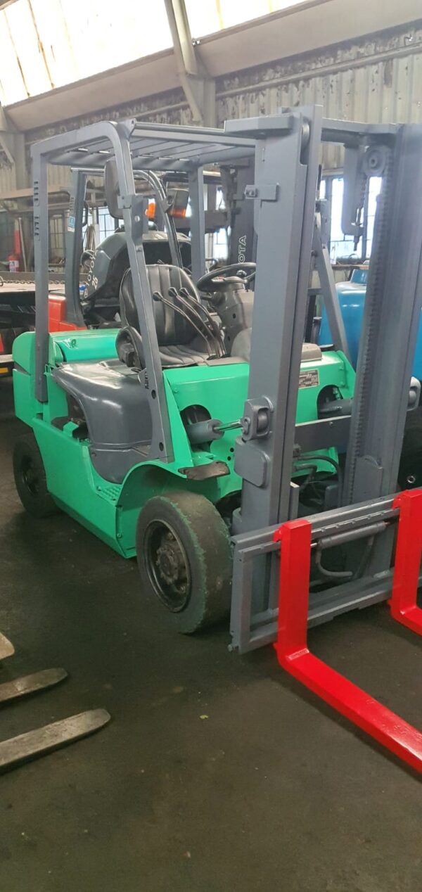 A reconditioned 2.5 ton Mitsubishi diesel forklift, 3m lift, new solid tyres, sideshift, repainted, POA, ex Jhb.